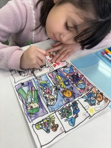 子ども達は、好きなキャラクターに基づいて構成を考え、色付けました。